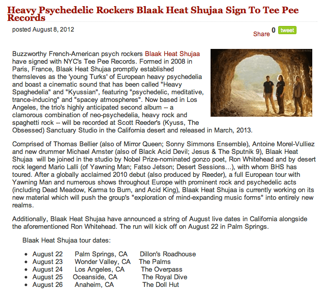 Buzzworthy French-American psych rockers BLAAK HEAT SHUJAA have signed with NYC’s Tee Pee Records. Formed in 2008 in Paris, France, BLAAK HEAT SHUJAA promptly established themsleves as the ‘young Turks’ of European heavy psychedelia and boast a cinematic sound that has been called “Heavy Spaghedelia” and ”Kyussian”, featuring “psychedelic, meditative, trance-inducing” and “spacey atmospheres”. Now based in Los Angeles, the trio’s highly anticipated second album — a clamorous combination of neo-psychedelia, heavy rock and spaghetti rock — will be recorded at Scott Reeder‘s (Kyuss, The Obsessed) Sanctuary Studio in the California desert and released in March, 2013.